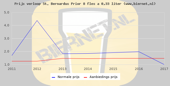 De gemiddelde prijs van een fles á 0,33 liter van St. Bernardus Prior 8 is €2,27 (€6,88 per liter). De gemiddelde prijs van St. Bernardus Prior 8 in de winkel is €7,69 per liter.