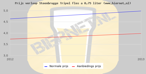 De gemiddelde prijs van een fles á 0,75 liter van Steenbrugge Tripel is niet bekend. De gemiddelde prijs van Steenbrugge Tripel in de winkel is niet bekend.