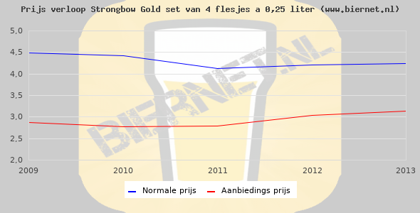 De gemiddelde prijs van een set van 4 flesjes á 0,25 liter van Strongbow Gold is niet bekend. De gemiddelde prijs van Strongbow Gold in de winkel is niet bekend.