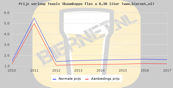 De gemiddelde prijs van een fles á 0,30 liter van Texels Skuumkoppe is €1,86 (€6,2 per liter). De gemiddelde prijs van Texels Skuumkoppe in de winkel is €5,27 per liter.