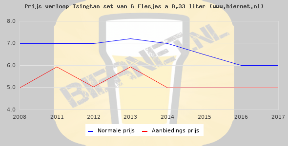 De gemiddelde prijs van een set van 6 flesjes á 0,33 liter van Tsingtao is €7,99 (€4,04 per liter). De gemiddelde prijs van Tsingtao in de winkel is €5,19 per liter.