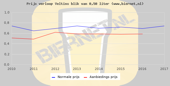 De gemiddelde prijs van een blik van 0,50 liter van Veltins Pilsener is €1,21 (€2,42 per liter). De gemiddelde prijs van Veltins Pilsener in de winkel is €2,53 per liter.