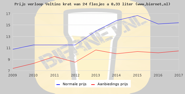 De gemiddelde prijs van een krat van 24 flesjes á 0,33 liter van Veltins Pilsener is €22,02 (€2,78 per liter). De gemiddelde prijs van Veltins Pilsener in de winkel is €2,53 per liter.