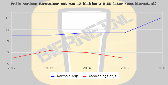 De gemiddelde prijs van een set van 12 blikjes á 0,33 liter van Warsteiner Premium Pilsener is €8,49 (€2,14 per liter). De gemiddelde prijs van Warsteiner Premium Pilsener in de winkel is €2,74 per liter.