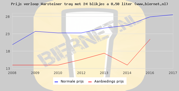 De gemiddelde prijs van een tray met 24 blikjes 0,50 liter van Warsteiner Premium Pilsener is niet bekend. De gemiddelde prijs van Warsteiner Premium Pilsener in de winkel is niet bekend.