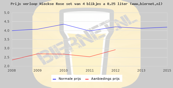 De gemiddelde prijs van een set van 4 blikjes á 0,25 liter van Wieckse Rose is niet bekend. De gemiddelde prijs van Wieckse Rose in de winkel is niet bekend.