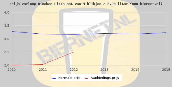 De gemiddelde prijs van een set van 4 blikjes á 0,25 liter van Wieckse Witte is niet bekend. De gemiddelde prijs van Wieckse Witte in de winkel is niet bekend.