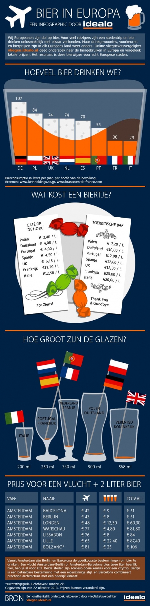 Niet alleen in Duitsland wordt veel bier gedronken, ook de rest van Europa kan er wat van. Toch verschillen de drinkgewoontes, prijzen en voorkeuren per land. Vliegtickets vergelijker Idealo deed daarom onderzoek naar de bier consumptie in Europa.