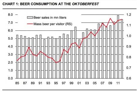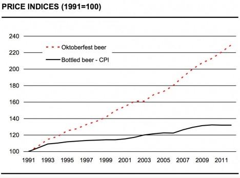 Bier is wat economen noemen een elastisch goed, hoe meer het kost , hoe minder mensen het kopen. Door het Oktoberfest snappen de economen niets meer van bier. Het bier wordt daar namelijk steeds duurder, maar er wordt ook ieder jaar meer van gedronken.