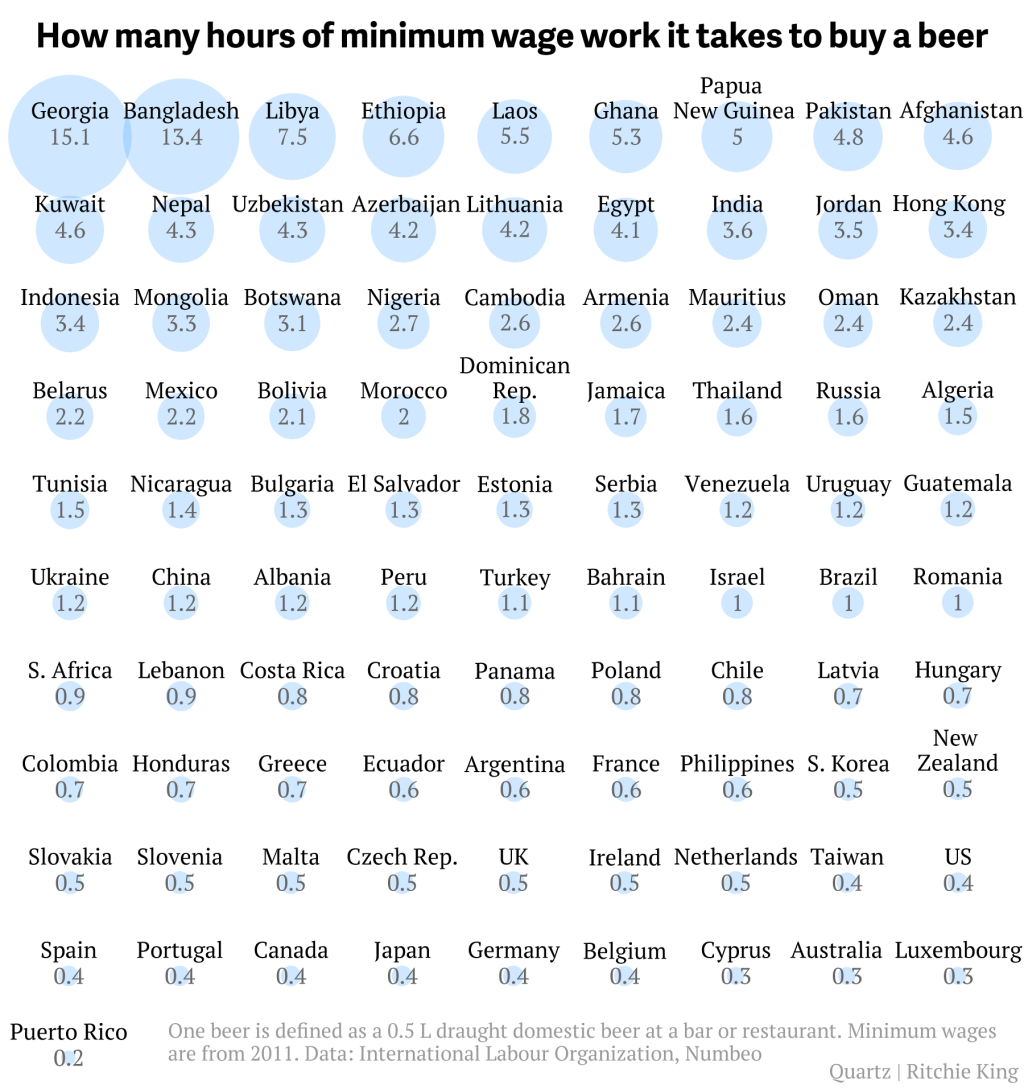 In deze vergelijking gaat Quartz trouwens uit van de prijs van een halve liter bier in dat land en het minimumllon van het betreffende land in 2011.