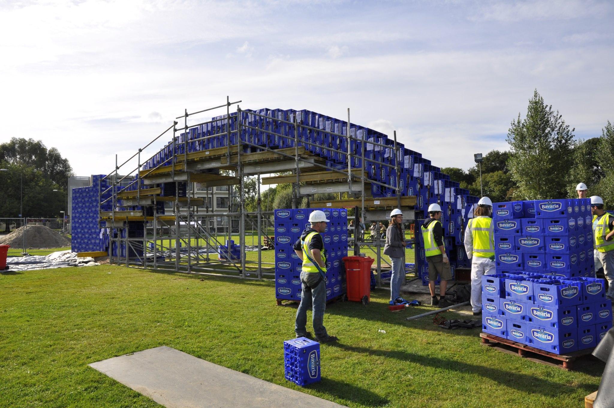 Studenten van de TU/e in Eindhoven hebben een brug van 19,55 meter gebouwd die alleen bestaat uit Bavaria bierkratjes.
