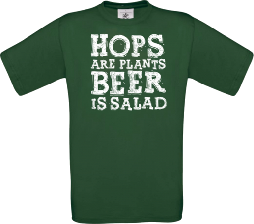 Ben jij een liefhebber van Hop? Dan ben je gezond bezig! De grappige tekst op dit T-shirt luidt namelijk: ''Hops are plants beer is salad''.